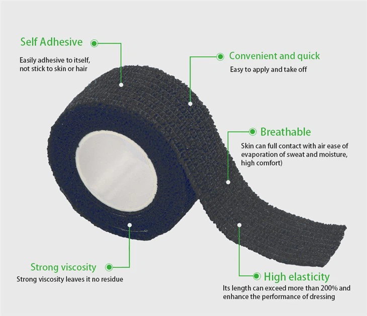 Siyah yapışkan bandaj, yüksek kaliteli elastik kumaştan yapılmış, elastik bezin her iki tarafında doğal polimer parçacıkları tabakası ile kaplanmış ve belirli bir işlemle işlenir. Yapışkan bandaj siyah ürünü saça, cilde, giysilere yapışmaz ve ter durumunda düşmez. Kendinden yapışkan elastik bandajların düzgün parlaklık, temiz insizyonlar, koku, leke ve açıkta olan çapakları olmalıdır; Kırılma kuvveti 10n/cm'den az olmamalıdır; Öz-yapışkanlık 3n/cm'den az olmamalıdır; Uzatma%50'den az olmamalıdır; Cilt tahrişi yok. Ürün, tıbbi basınca duyarlı yapıştırıcı veya doğal lateks, dokuma olmayan kumaş, kinesio yama, elastik kumaş, tıbbi yağlayıcı gazlı bez, elastik dokuma olmayan kumaş ve doğal kauçuk kompozit malzemelerle kaplanmış saf pamuklu kumaştan yapılmıştır. Ayrıca ortopedi, genel cerrahi, ortopedi ve vasküler hastalıklarda hastaları giydirmek için ideal bir üründür.
